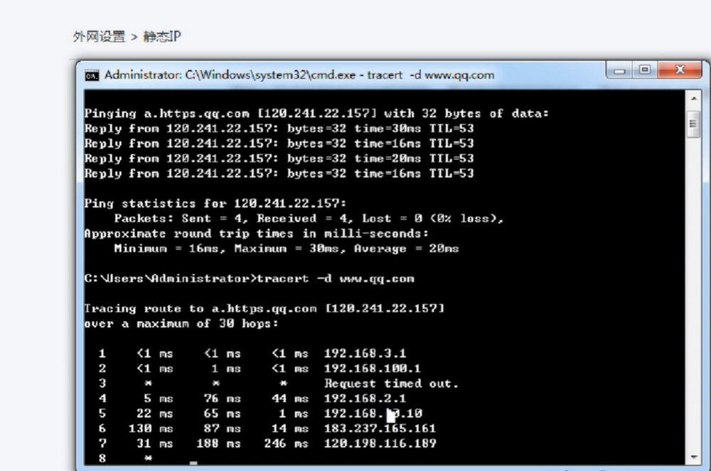 通过tracert命令测试信号所经的路径。
