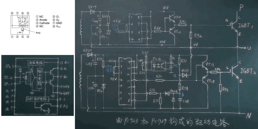 驱动芯片PC929和PC923组成的驱动电路检修方法【为了减少不必要的麻烦都是将功率模块与电路分离,在确保驱动电路没问题之后才可以装功率IGBT模块】评定驱动电路工作正常的标准:能够正常的传输和放大六路驱动脉冲。