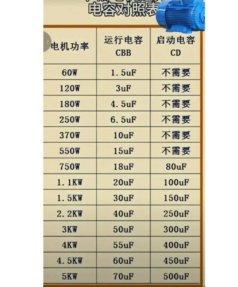单相电机启动电容对照表
