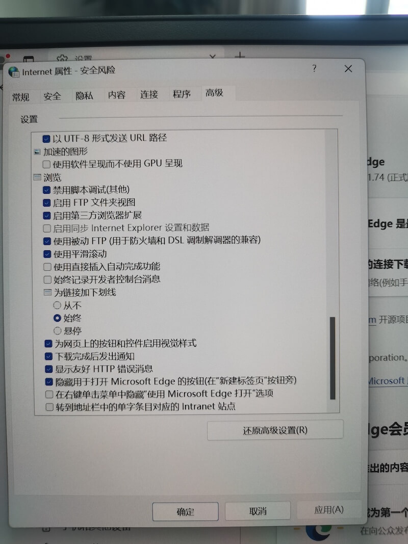 打开Internet属性在高级中关掉SSL 并打开TLS1.0 TLS1.1 TLS1.2 TLS1.3等项