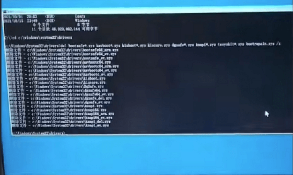 以上方式都不成功,用高级选项中的—–命令行模式 输入C:\>dir查看是否为系统盘,如果内部有windows、user就说明是系统盘。此时转到c:\windows\system32\drivers路径执行del bootsafe*.sys kavboot*.sys kisboot*.sys kiscore.sys dgsage*.sys ksapi*.sys tssyskit*.sys bootrepair.sys /s