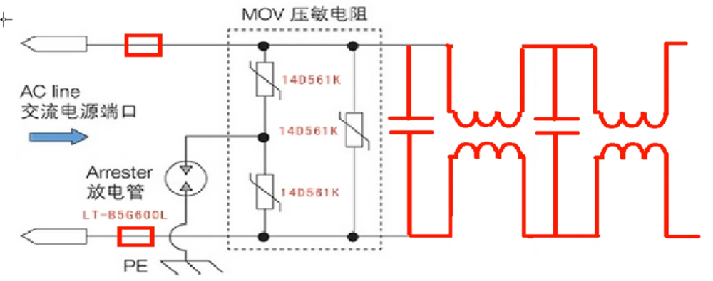 压敏电阻与气体放电管在实际电路中的应用示例。放电管在中间两端有压敏电阻是因为不确定L还是N被击中,从而进行放电。