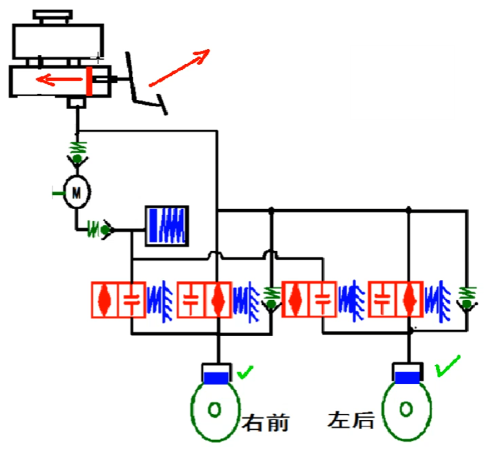 ABS系统控制分为三步:1、增压模式; 2、减压模式; 3、保压模式,下面以增压式为例:单向阀是从下向上走的,绿线为油路的走向,通过进油阀到各个车轮的储油泵内。踏板踩的的凸轮或偏心注塞泵。