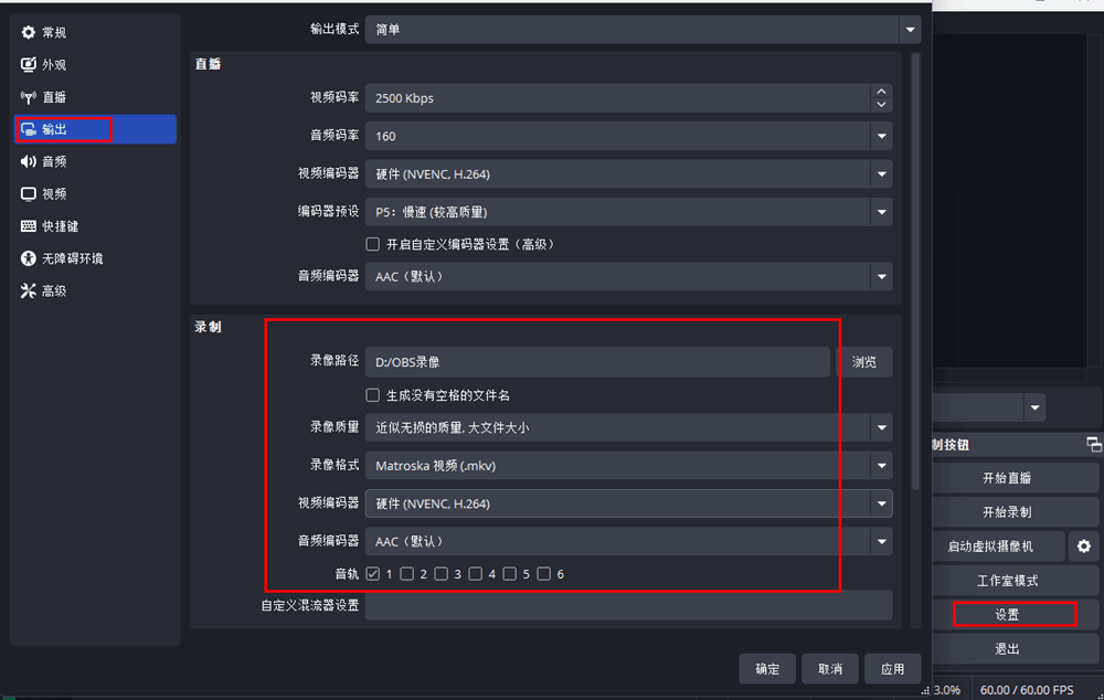 3、设置——输出——输出模式【选高级级】在录像项中找到音轨栏全部勾选
