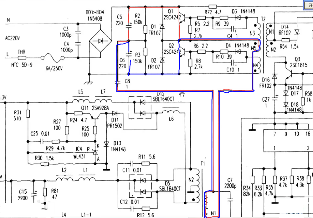 半桥电路的特征是有两个串关的电解电容,两电容中间节点有耦合电容,再经上桥的CE到半桥变压器线圈到达电容的负极【电容是从正极出来,所以最终是要到达电容负极的】