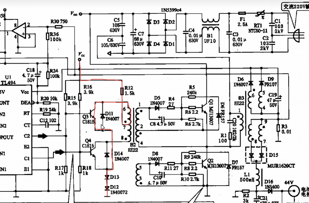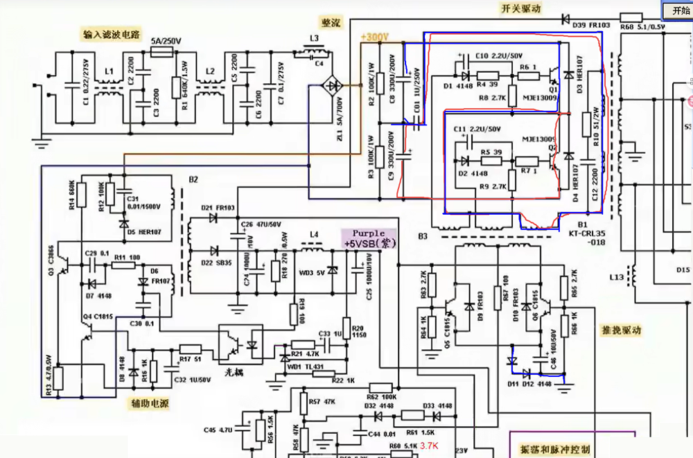 多数的电路是由芯片进行推挽驱动,来驱动推挽变压器,驱动推挽变压器来驱动半桥电路,半桥电路再来驱动半桥变压器,从而输出各路电压,注:此电路中的半桥两个电容串联用的是无极性小容量电容,所以就不需要匀压电阻了,因为是充电电路功率比较小。