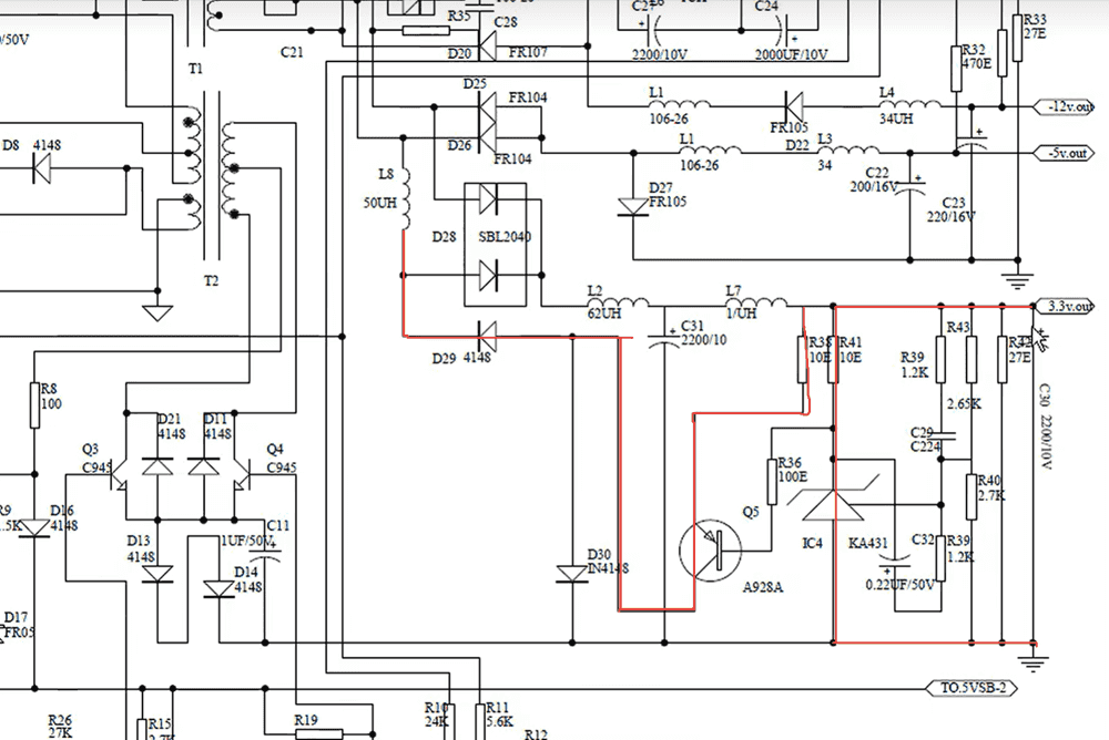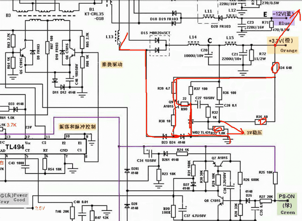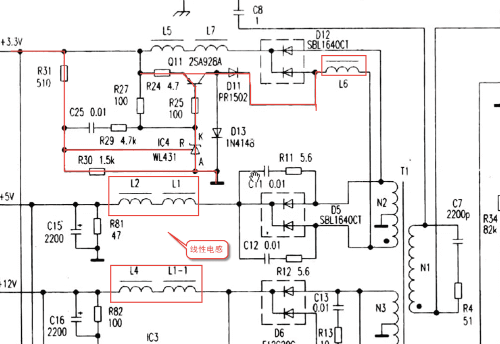 一般3.3V的输出电压才有磁放大稳压电路,因为开关电源本来就有稳压电路,只不过3.3V的对稳压要求更高,3.3V一般是给CPU、内存芯片等精密芯片供电,所以采用此稳压电路;