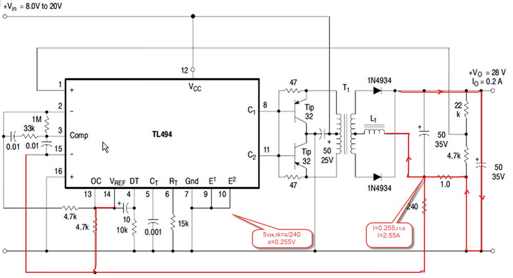 2脚是通过14脚5v参考电压得来,所以输出只要大于5V那么就会改变8、11脚的输出占空比;这是电压的反馈
