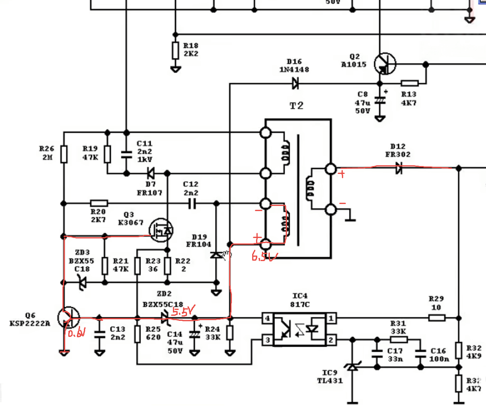 当输出电压偏高时,如5V输出为6.5V时则二次供电绕组也会升高从而击穿5.5V的稳压管使Q6也导通拉低Q3的G极,使电压降下来;【前端电压反馈】