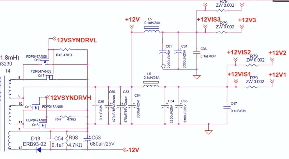 - 由芯片控制的同步整流电路,其中的12VSYNDRVL和12VSYNDRVH是由芯片SRDRV引脚同步的。