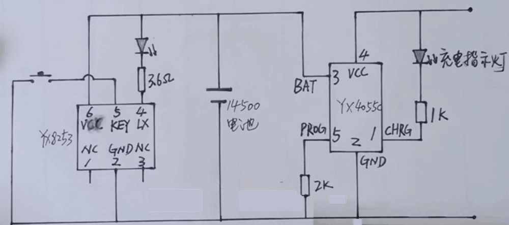 它的内部电路图,如下图所示。它由YX8253芯片,SOT23-6封装【丝印IATCB】和YX4055C芯片,SOT23-5封装【丝印KAKGB】