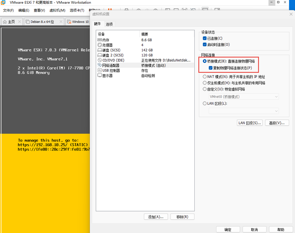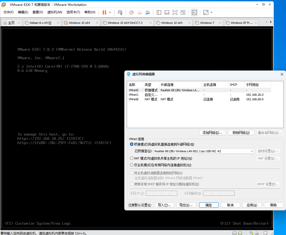 在vmware workstation中安装ESXI后如果使用WIFI上网,将VMWARE WORKSTATION中设置为网桥模式