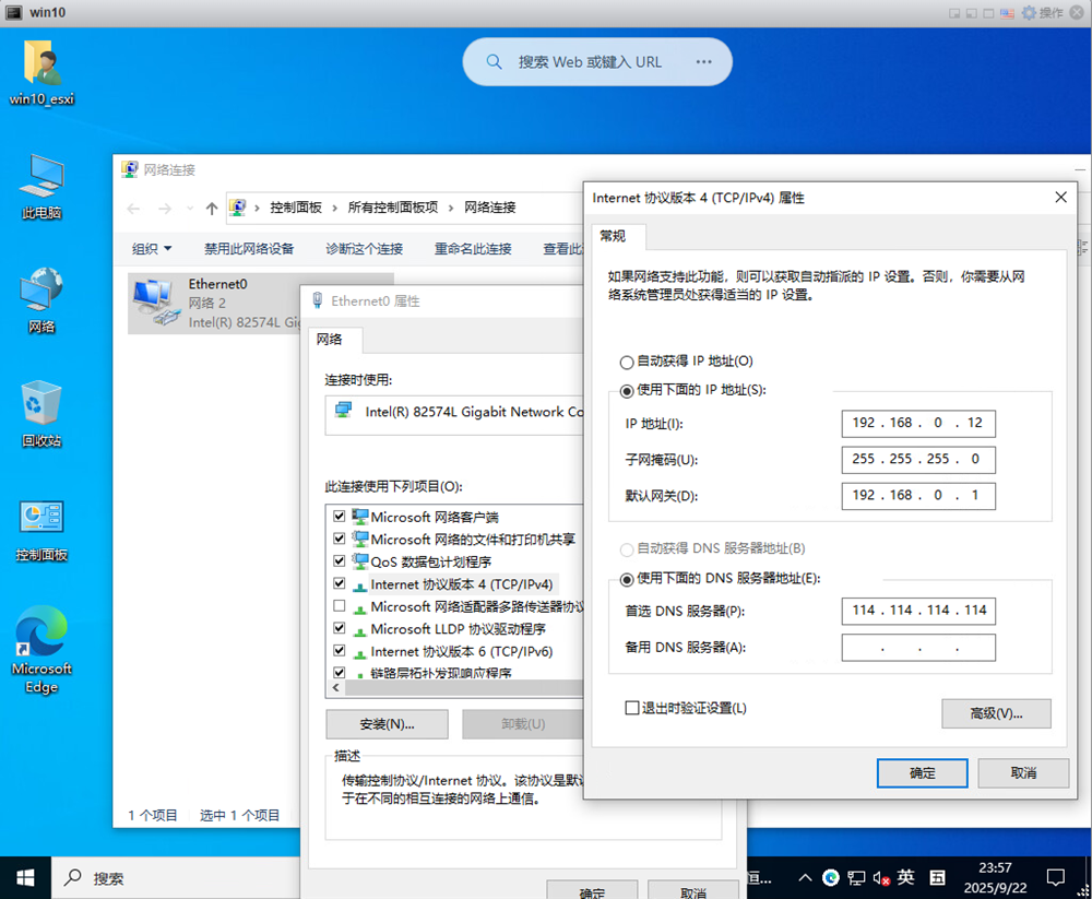 进入ESXI虚拟机后也要将地址设为同一网段,经过以上的配置就成功了。