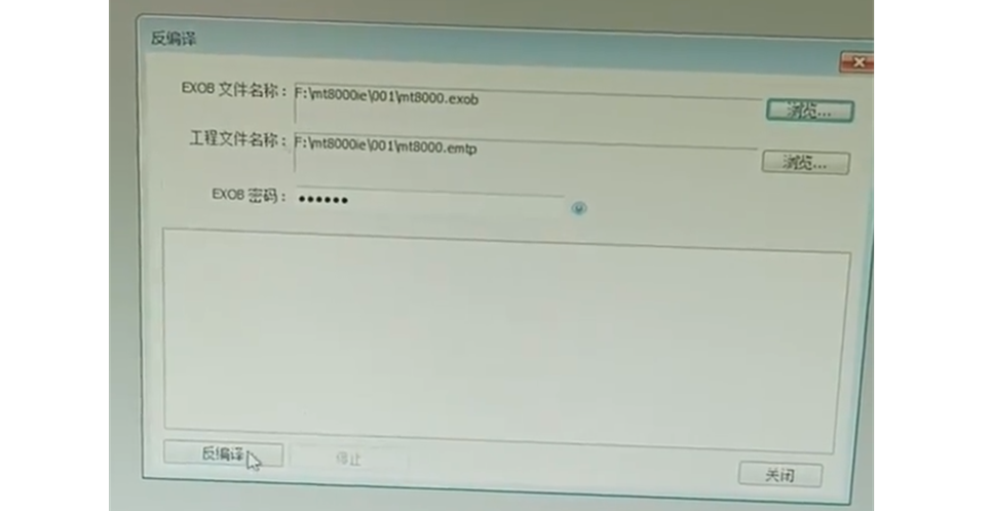 5、把优盘拔出插到电脑上,优盘中mt8000ie就是上传的程序,如果要对程序进行修改的话,需要打开easybuilder pro进行反编译;文件——反编译——-浏览找到优盘——发现001文件夹是空的,因为反编译只支持EXOB格式的文件;