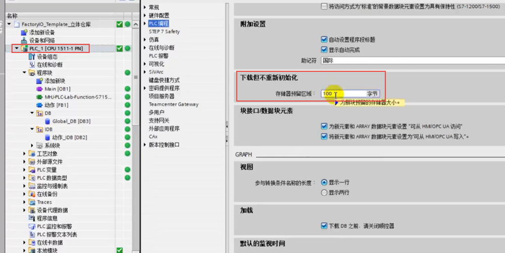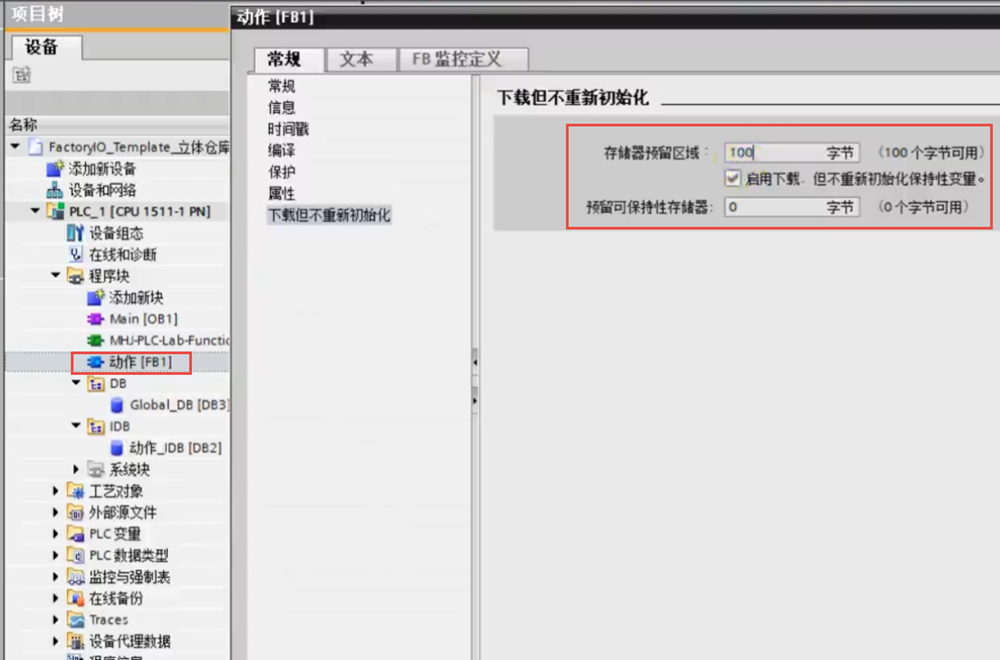 选择某个FB、FC、DB块等,再更改存储器预留区域的大小,这是局部的修改。注,预留可保持性存储器的容量也要改,如下图,可以都设成100字节;
