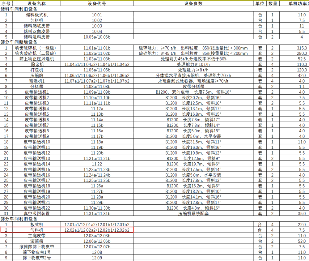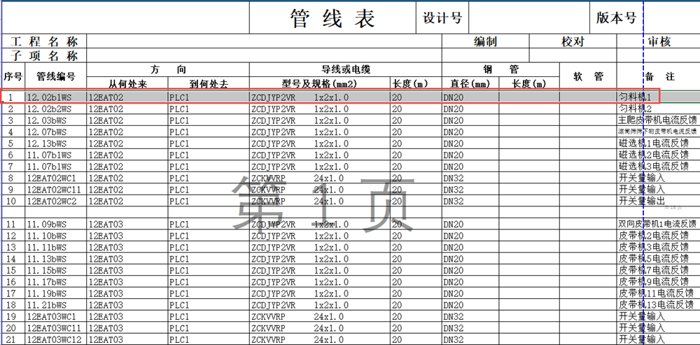 从管线表或电缆表中可以找到线束的走向从哪里到哪里去,下面以"匀料机1"为例;