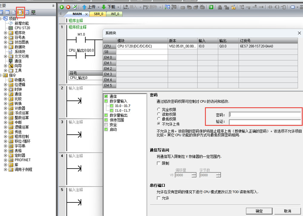 2、在"系统块"——安全中点击"不允许上传", 该级别的保护即使用正确的密码,也无法进行上PLC中的程序到电脑中。所以这个密码一定要记住。