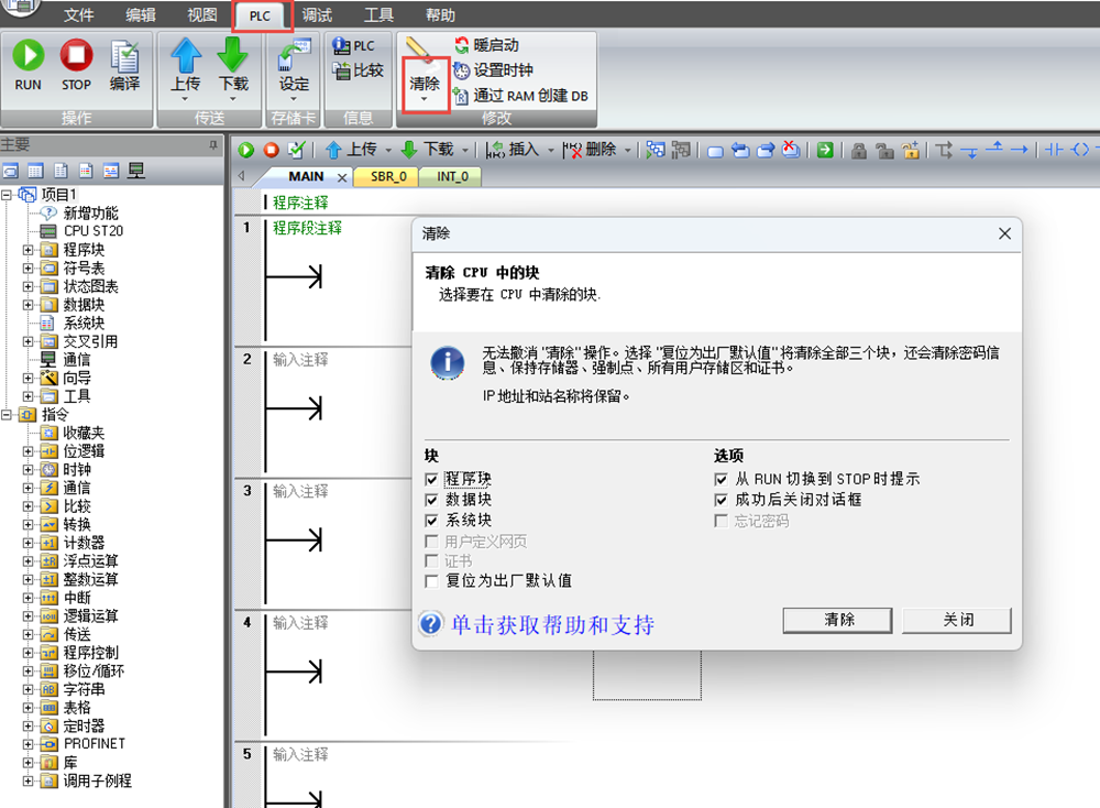 2、点击菜单栏中的PLC——-清除——–也就意味着PLC中的所有数据都将被清空。完全变成一个空PLC;