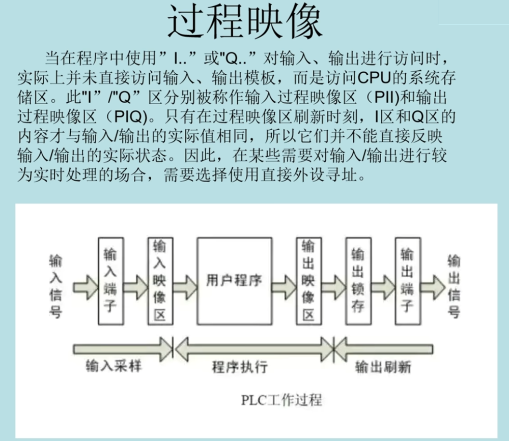 PLC过程映像的工作过程,用户访问IQ区的数据时,并不是直接访问实际的输入,输出区,而是访问的输入,输出映像区;