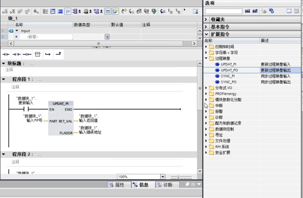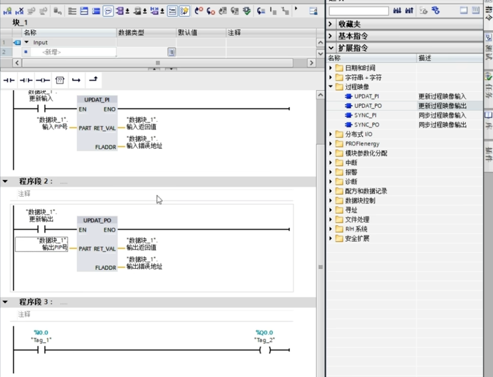 它的指令在扩展指令——-过程映像——-UPDAT_PI指令;一个是"更新过程映像的输入",一个是"更新过程映像的输出"。