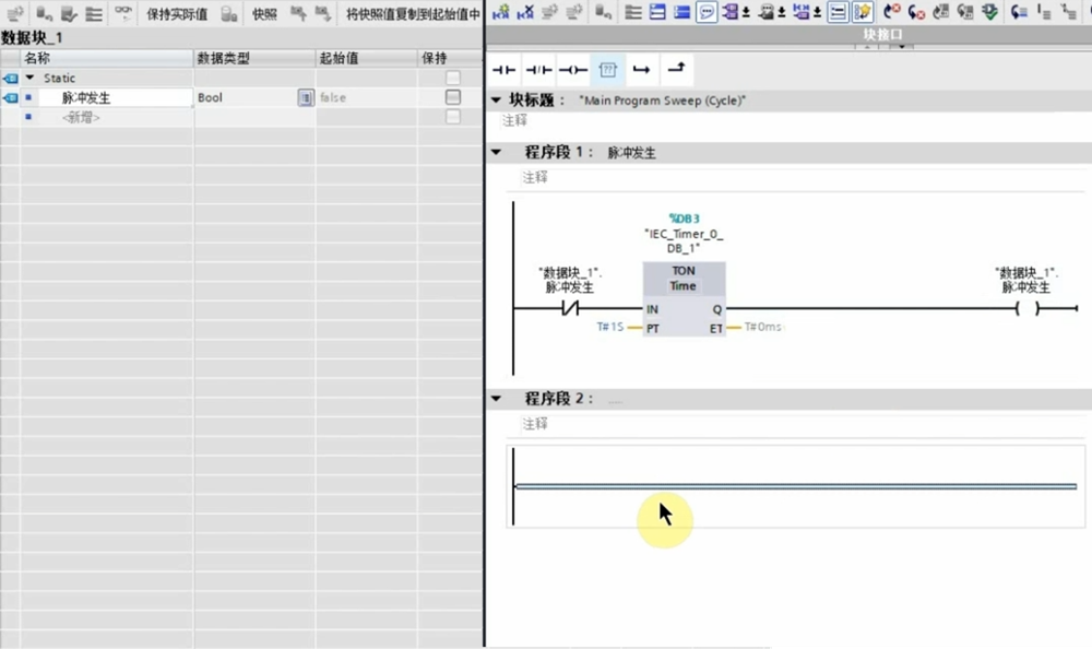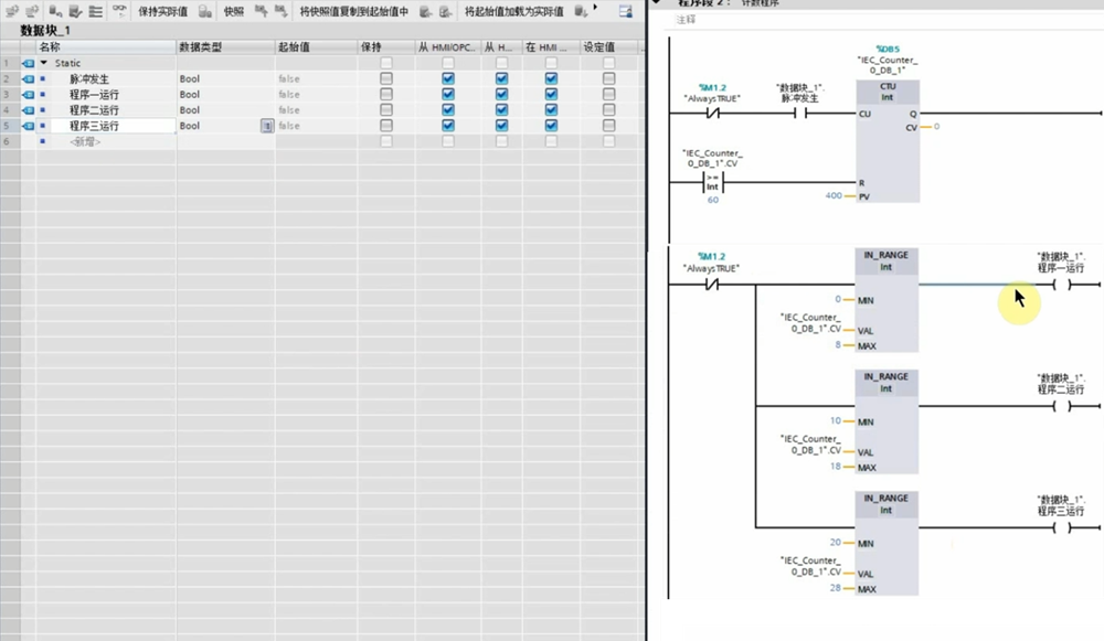设备通讯轮询程序 设备通讯轮询程序 这个网络段就是每隔1秒钟,脉冲发生线圈会导通一次,并很快截止;它就是实现一个计数器累加用的。 计数在某个数值范围内,让某个程序段接通。例如:让计数器每到60秒即1分钟就复位;如果计数器的当前值在0到8之间,程序1运行;计数器的当前值在10到18之间,程序2运行;计数器的当前值在20到28之间,程序3运行;每个留有2秒断开时间,到30秒后计数器复位。注:m1.2得用常开点位; 总结:接通延时器的应用,累加计数器的应用;还有Range范围函数的应用;