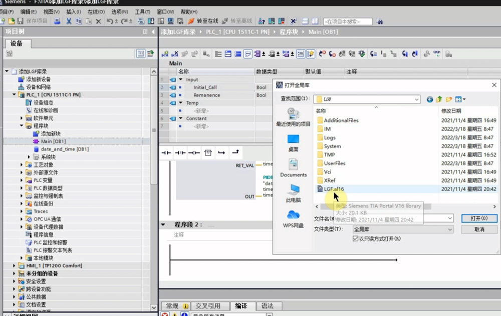 要下载对应的博途版本,否则的话,是仿真不了的;本例是以博途V16为例;菜单栏中的选项—–全局库——-打开库….