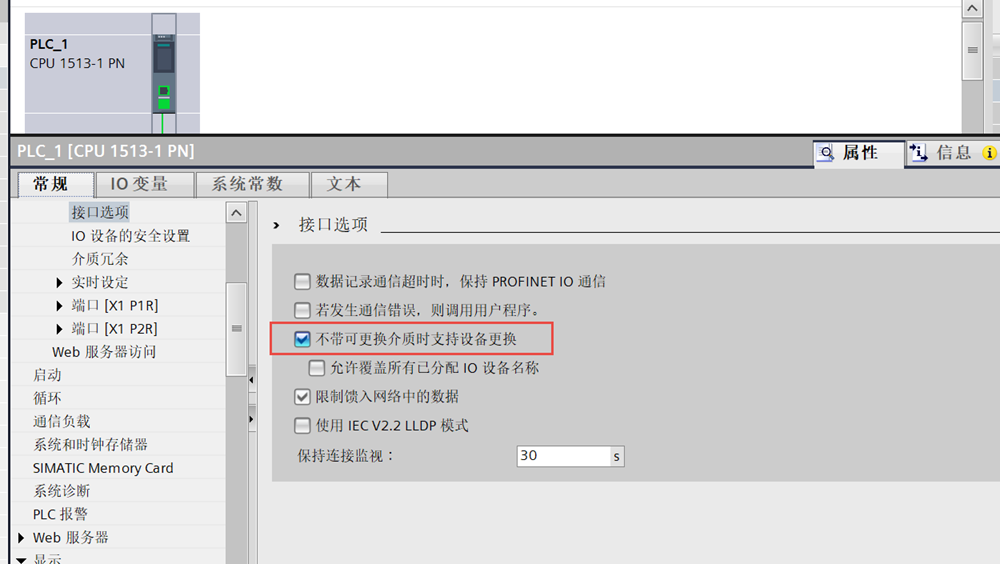 在组态PLC的属性里边有这么一个选项,默认的是不打勾的,在常规——PROFINET接口——高级选项——接口选项——-勾选不带可更换介质的支持设备更换。