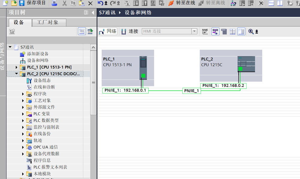 S7通讯也叫单边通信,是西门子的私有协议,在博途中新建两个PLC,分别是一个客户端1215C,一个服务器端1513;在网络视图中点击显示IP地址的小眼睛,将两个PLC用线连接起来,把它们建立到一个子网里;