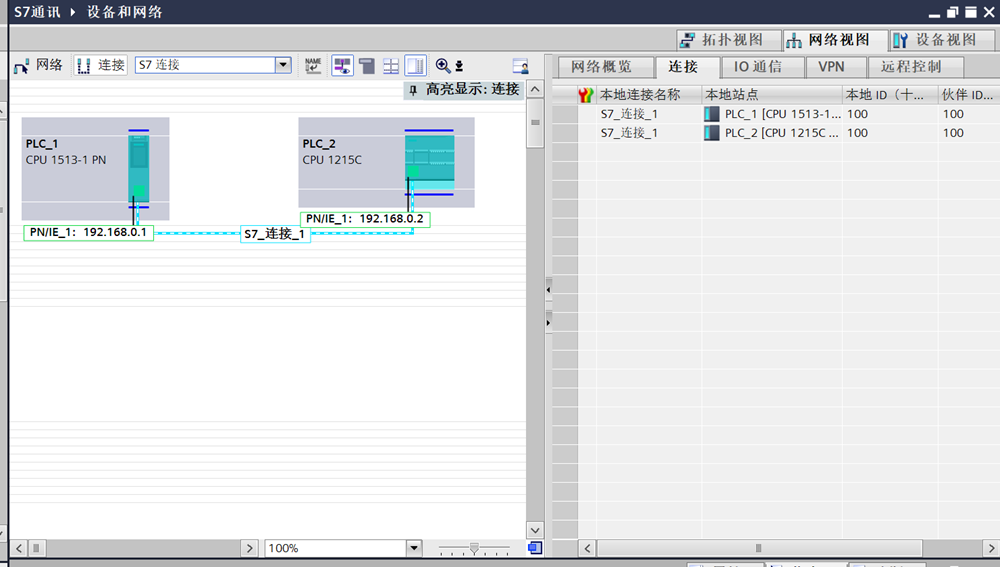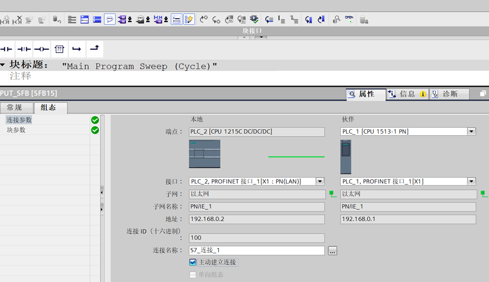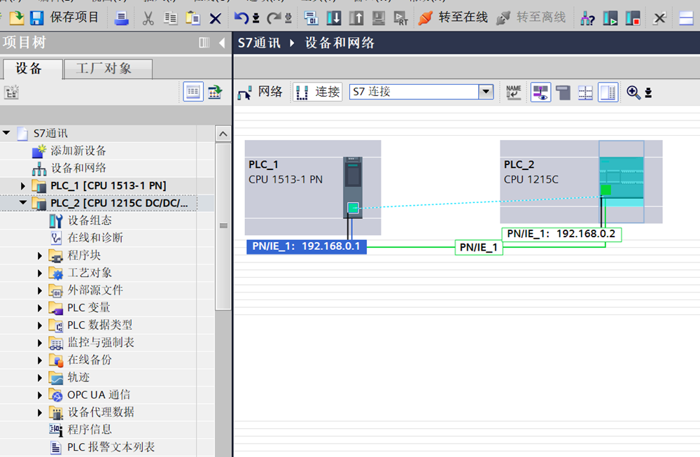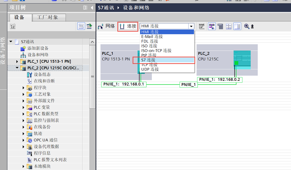 将两个PLC使用S"7连接"连接起来组成网络。这样S7连接就已经建立成功了。