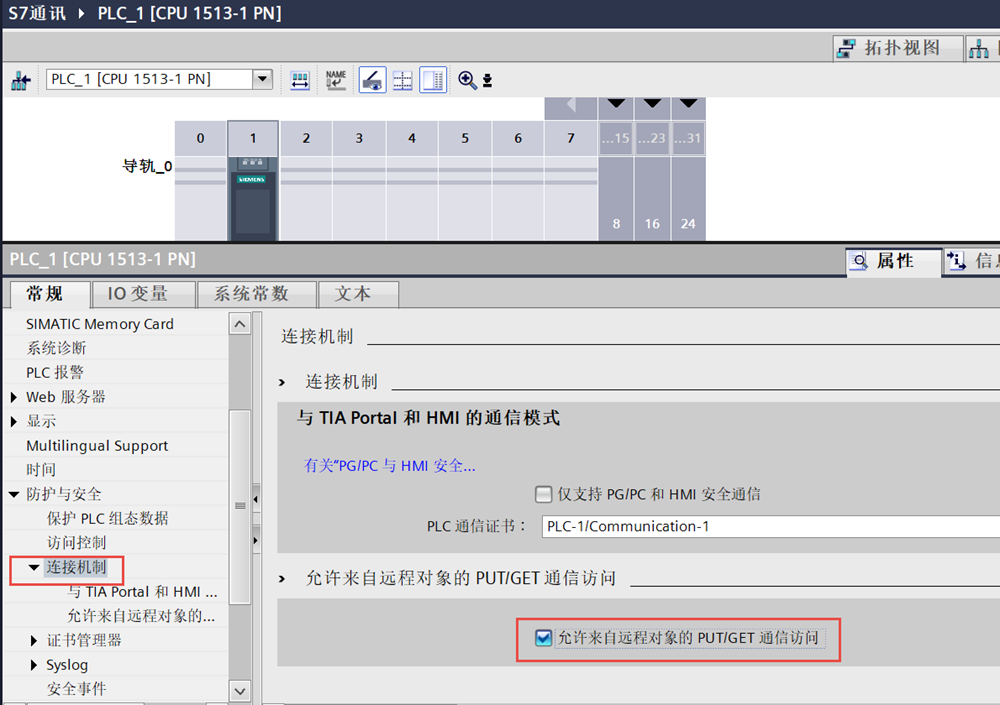 为了能够可靠的连接需要在服务器端1513,在常规——-防护与安全——-连接机制——-勾选允许来自远程对象的的PUT/GET通信访问。对于客户端的"连接机制"不需要勾选;