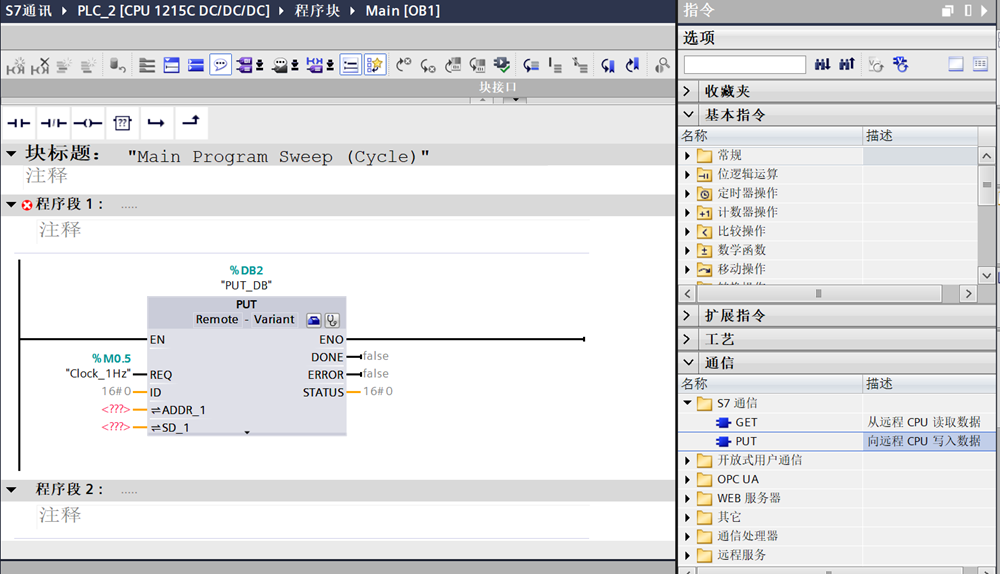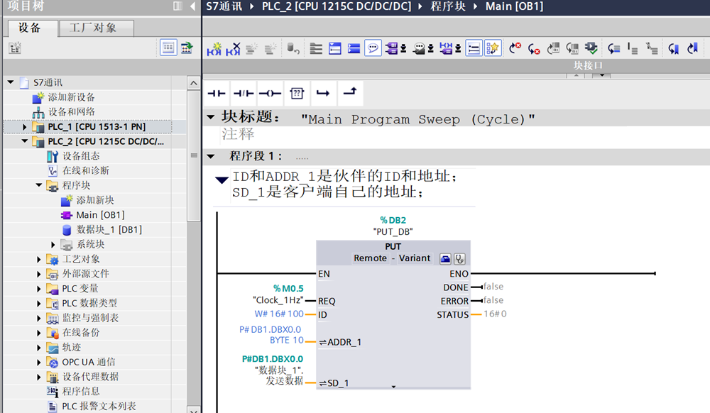 在客户端的主程序中拖放一个PUT发送数据指令,填写相关引脚;SD_1是客户端中的发送数据块;