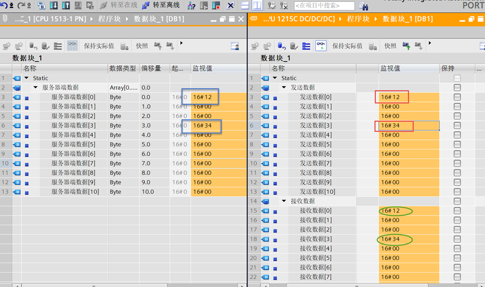 在客户端的发送数据区修改数据,在服务器的数据区浅蓝色和客户端的接收区绿色都会发生变化;