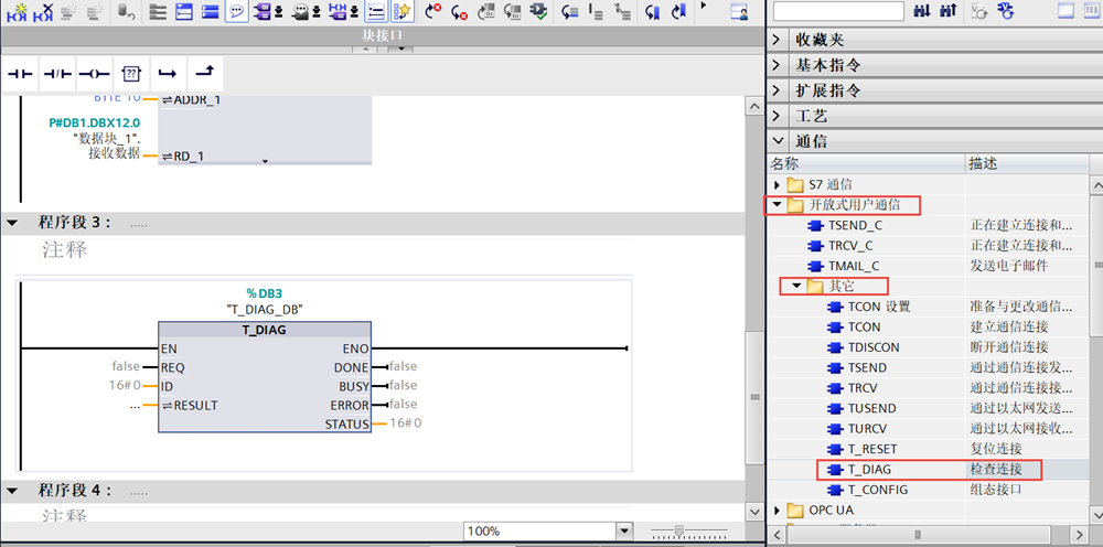 1、在通讯指令集里面找到开放式用户通讯,找到其它然后再找到T-DIAG指令,它的名称叫"检查连接"; 它可以检查TCP通信,UDP,Modbus TCP, S7通信的连接状态是否正常。