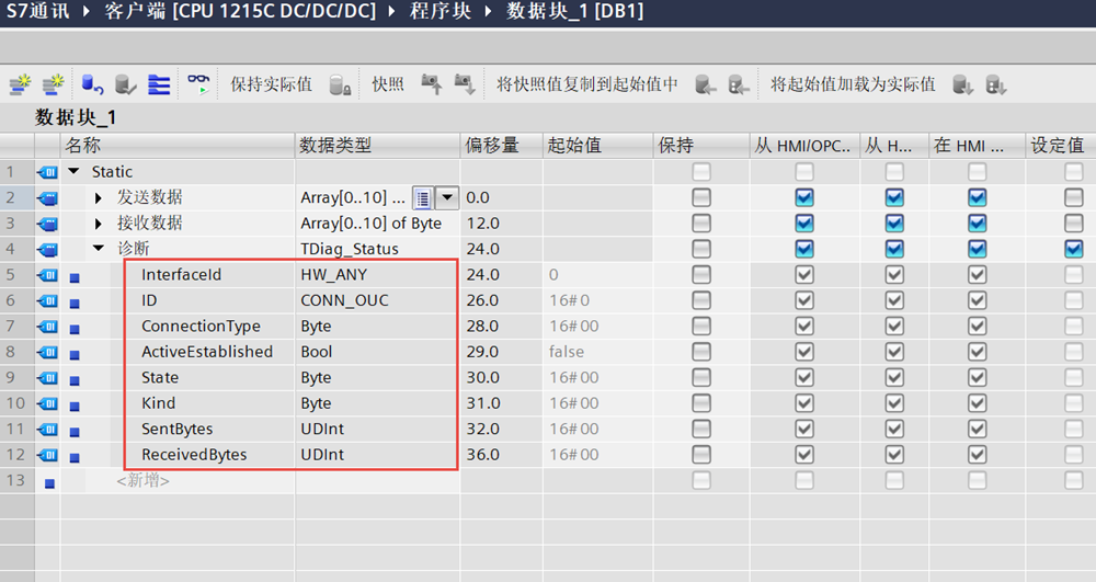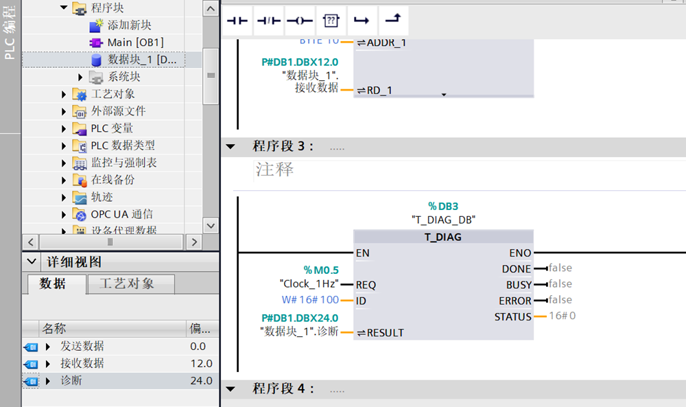 当我们将通讯线掉掉或断开PLC通讯就没有数据了,status的值也由原来的4变成了1说明连接中断。而且还可以通过T-DIAG指令获取更多关于通信的相关信息。