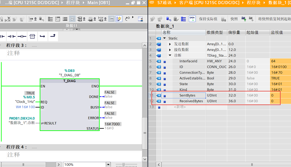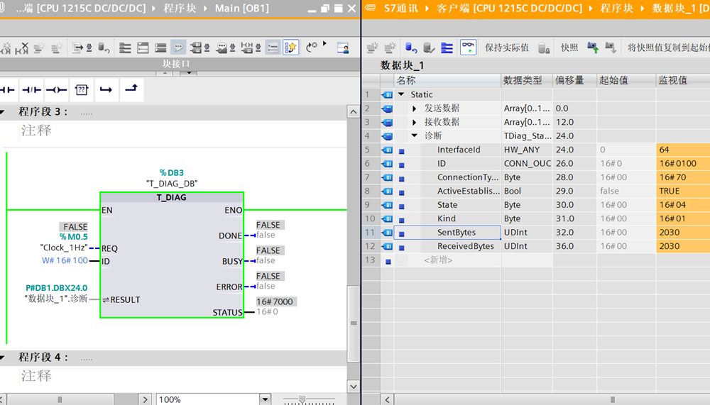 将两台PLC下载并启动,并且可以看到连接成功,发送数据和连接数据都在不断增加,说明通讯交互的数据都正常。