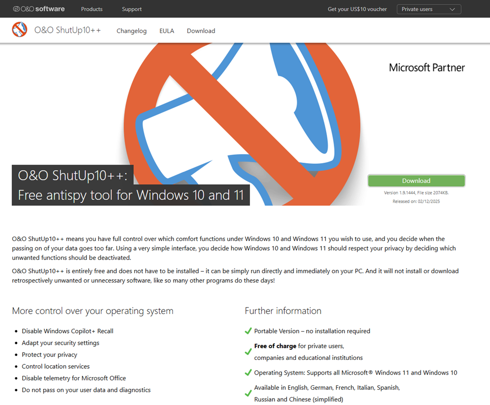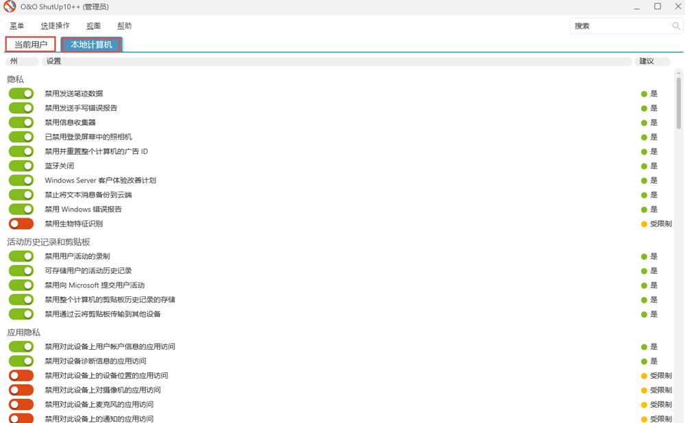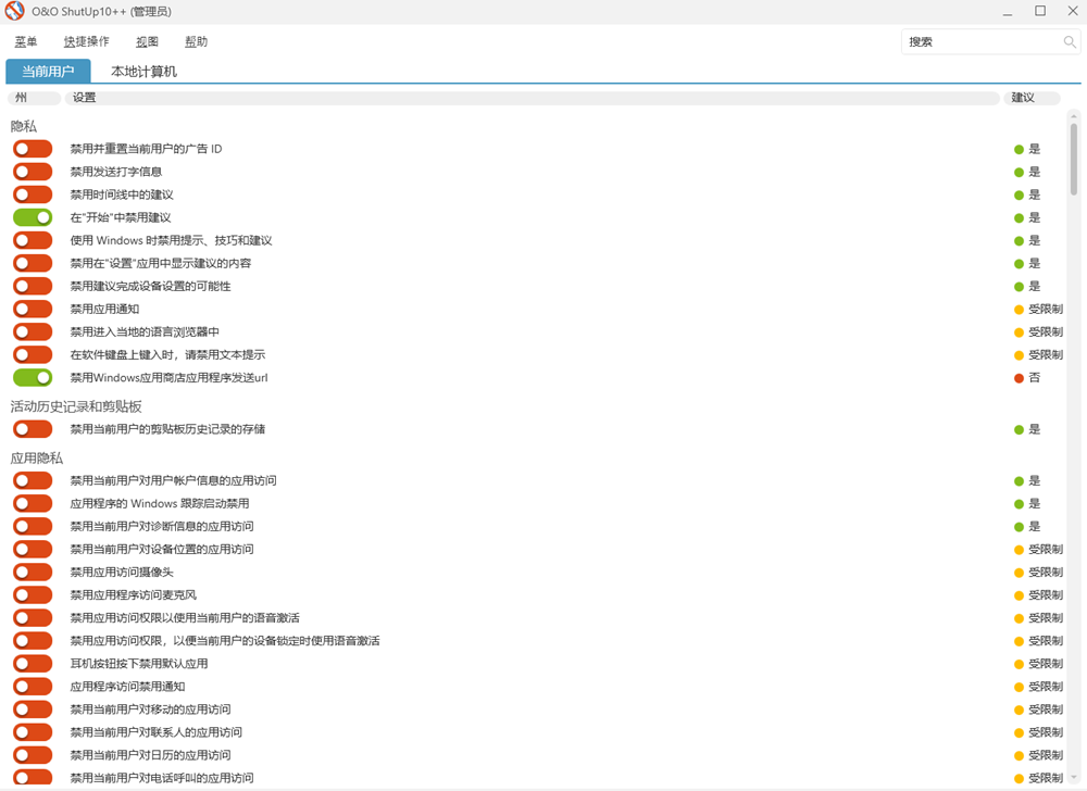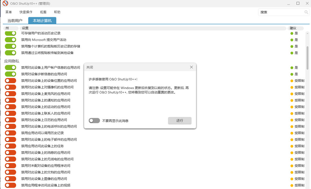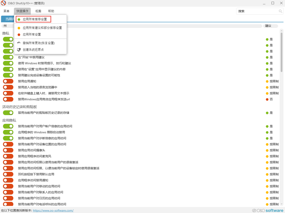 注意:设置可能会在windows更新后恢复到以前的状态,更新后,再次运行shutup10++,你将看到你可以自动重置的更改。