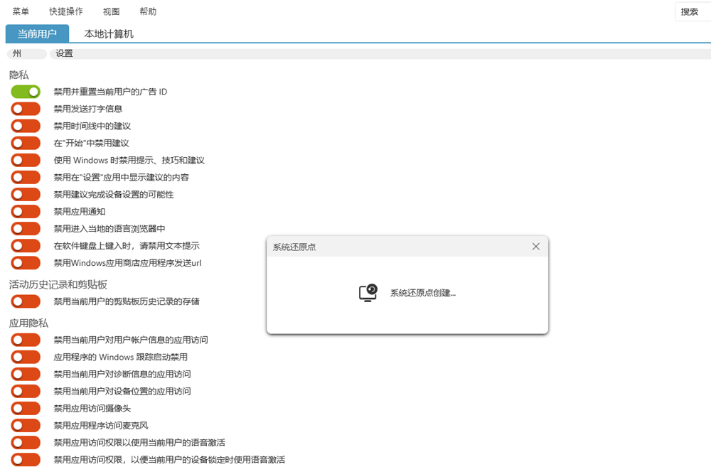 在进行配置之前我们要进行对电脑系统做一个系统的还原点,这相当于给系统拍了一个快照,优化之后发现哪个软件的不能用了,或者系统哪里不对劲,我们可以轻松恢复到修改之前的状态。注:刚开始点任何按钮都会提示创建还原点,也可以从菜单栏——快捷操作中创建还原点。