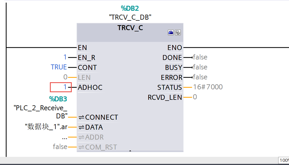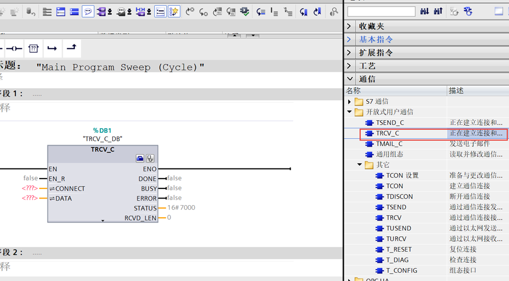 在通信指令—–开放式用户通信【这里主要是做TCP通信的】——–TRCV_C【这个指令就含有建立连接和接收数据】