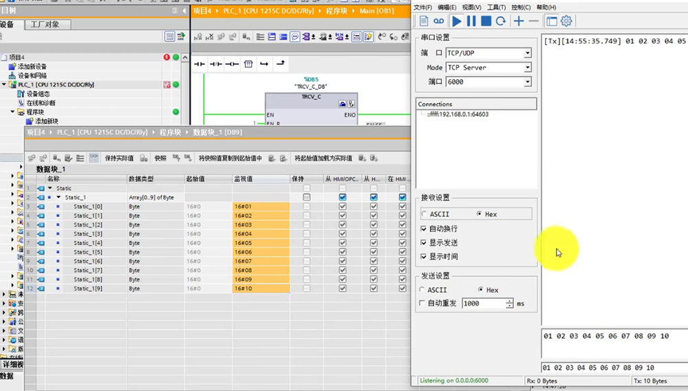 新建一个10字节的byte数组,也就是扫码枪那边发过来的数据,一次不能超过10个字节,这样编程组态就完成了。将程序下载到PLC进行测试。
