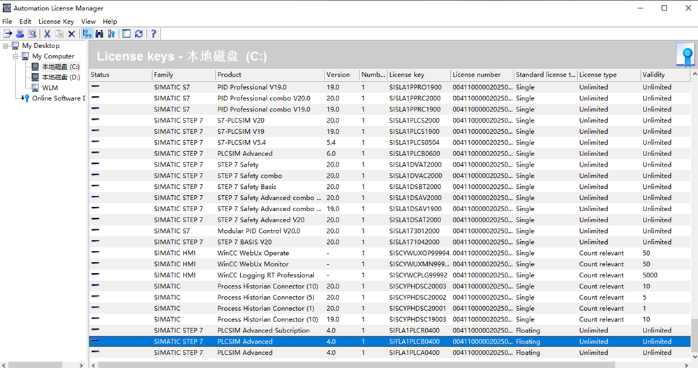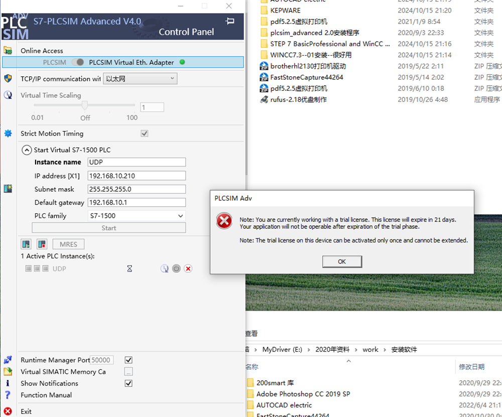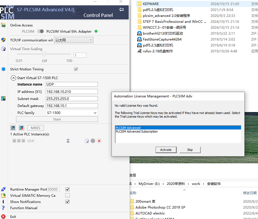 PLCSIM Advanced 4.0与博途TIV V20要分开激活;下图中PLCSIM Advanced 4.0已经激活成功了。