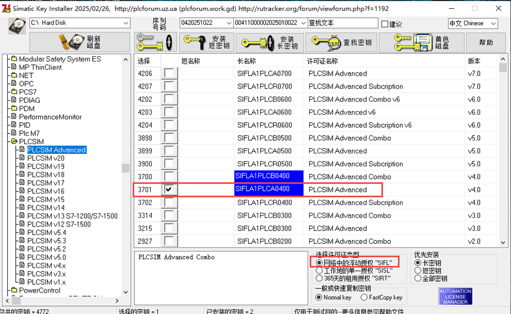 对PLCSIM Advanced 4.0进行激活,以管理员权限打开破解软件;注意,需要选择"网络中的浮动授权";