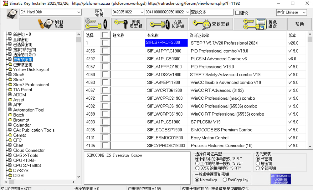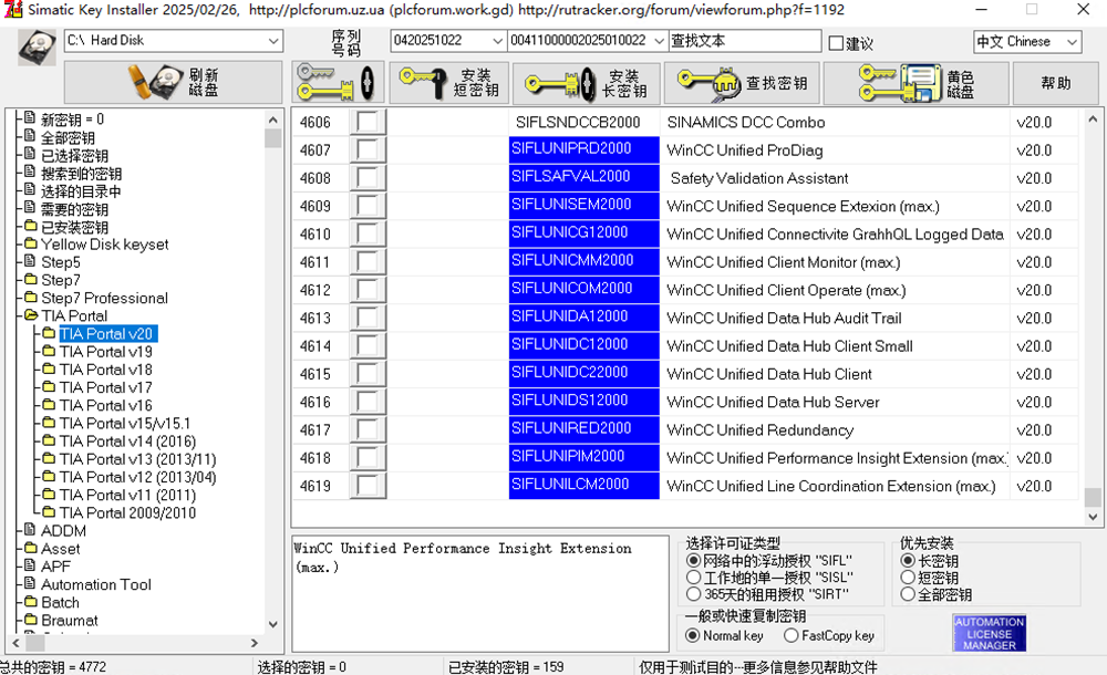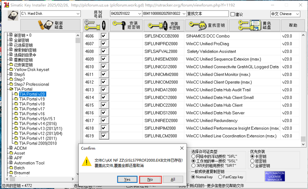 在博途V20中激活在"需要的密钥",只选一项即可;