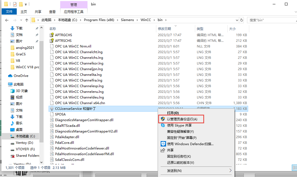 - 从破解文件夹中复制CClicenseService和谐补丁到路径C:\Program Files (x86)\Common Files\Siemens\Bin,在文件夹的空白处右键点击,选择【粘贴】按钮