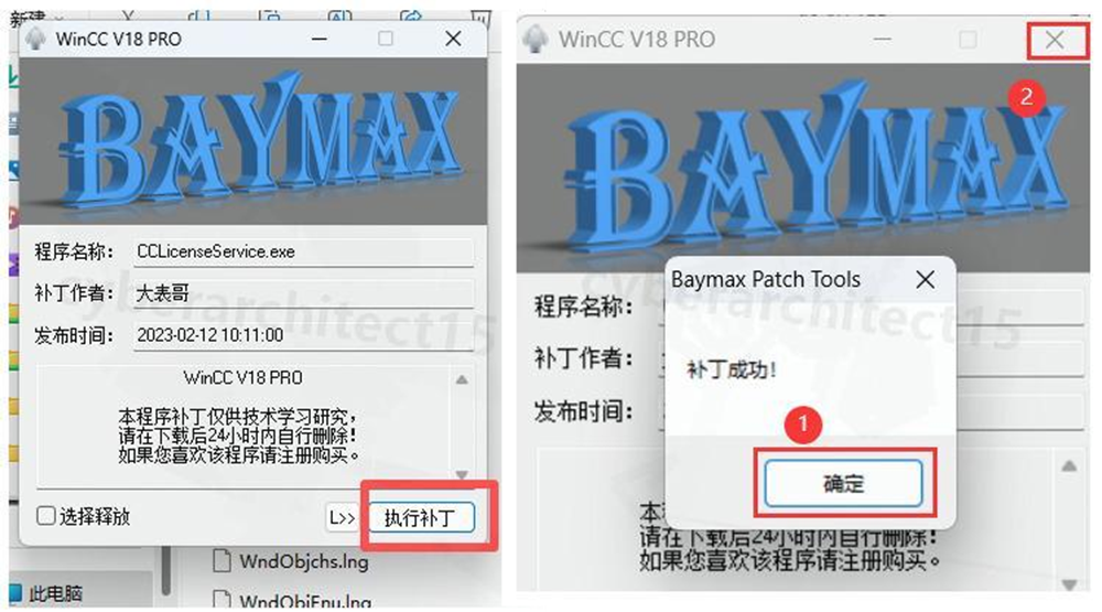 - 在打开的界面中点击【执行补丁】按钮。别担心,这只是配置软件所需的信息。看到提示后点击【确定】,再点右上角【关闭】按钮。到这一步,软件的基本配置就完成了。