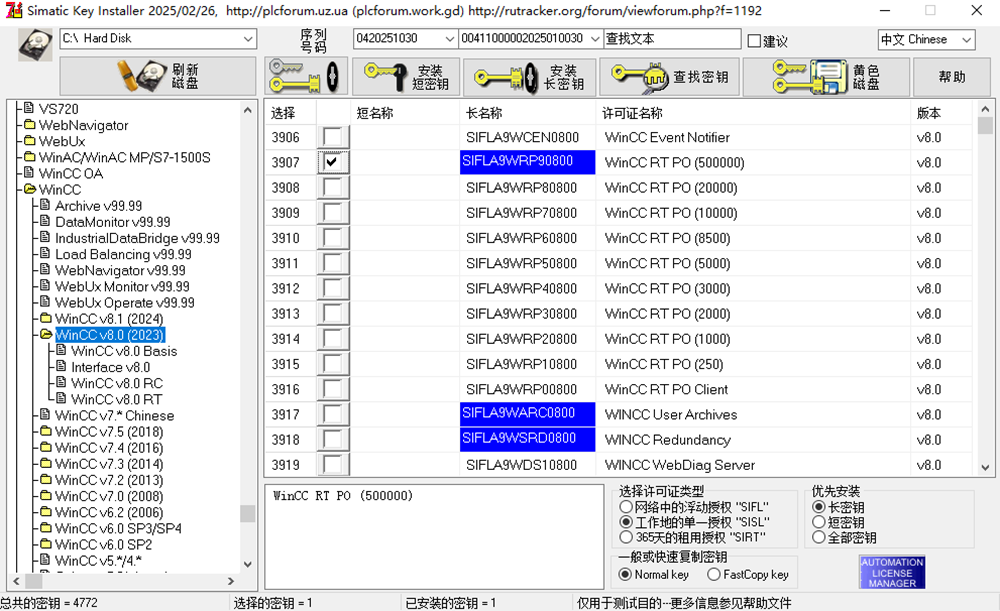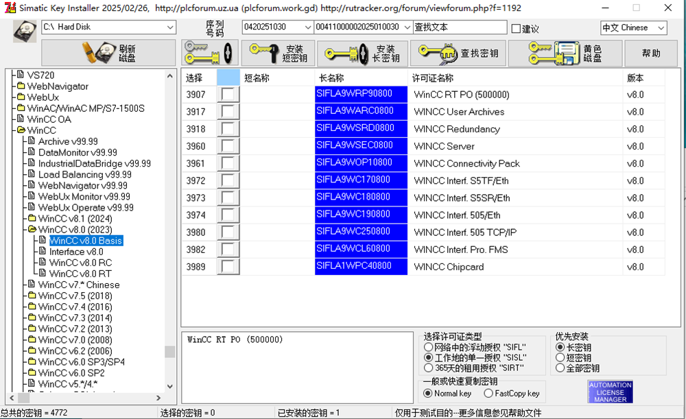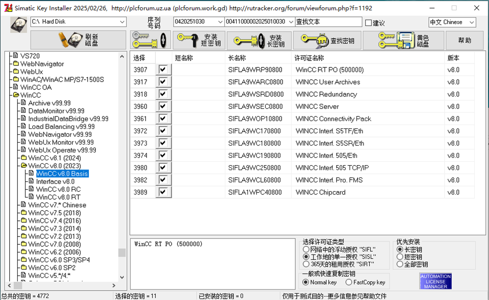 - 在打开的界面中,依次双击左侧的【WinCC】、【WinCC v8.0(2023)】、【WinCC v8.0 Basis】,然后勾选全部【短名称】,最后点击【安装长密钥】。这步是配置软件的功能模块。