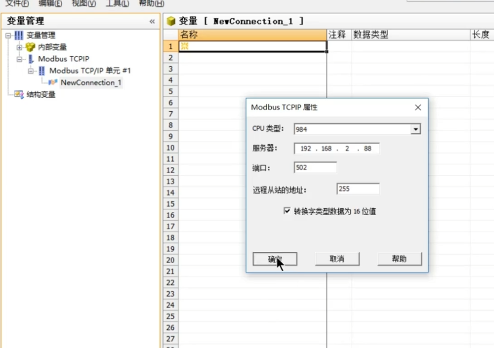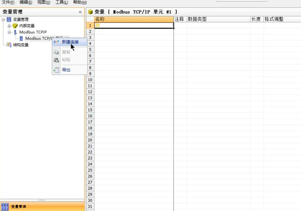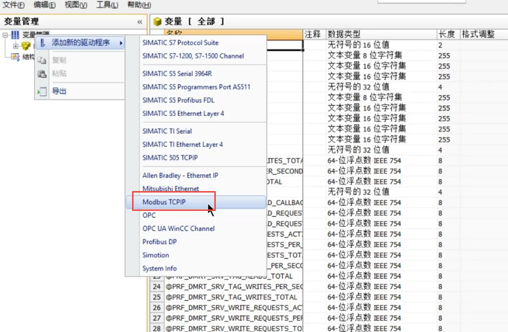 2、在wincc中新建一个项目,并创建一个新的连接;双击变量管理——右击添加新的驱动程序—-找到Modbus TCPIP