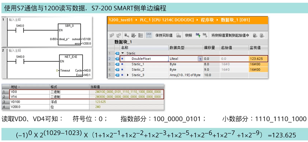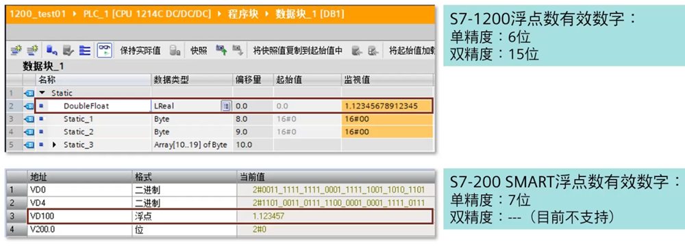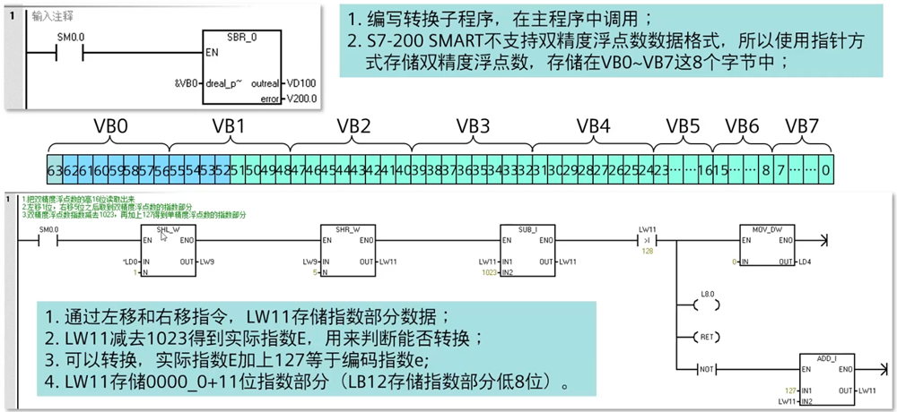 - S7-200 SMART不支持双精度浮点数数据格式,所以使用指针方式存储双精度浮点数,存储在VB0~VB7这8个字节中;