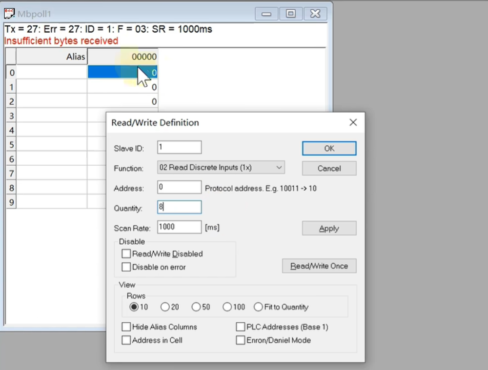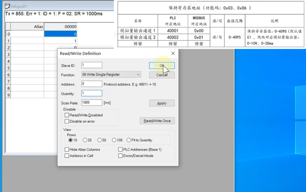 2、再设置一下读写定义,从站号是1也就是液位采集设备的站地址;没有连接上显示红色的字符,点击OK连接上就好了。