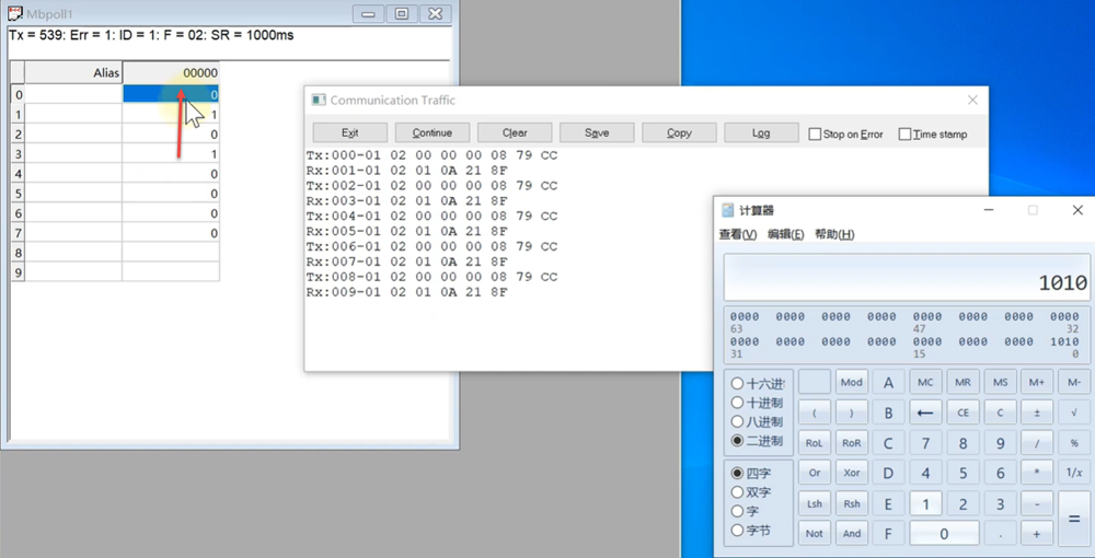 可以查看通讯的报文,数字量输入的读取;读到数据是16x0A,也就是二进制的1010