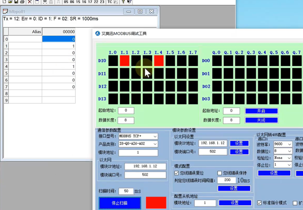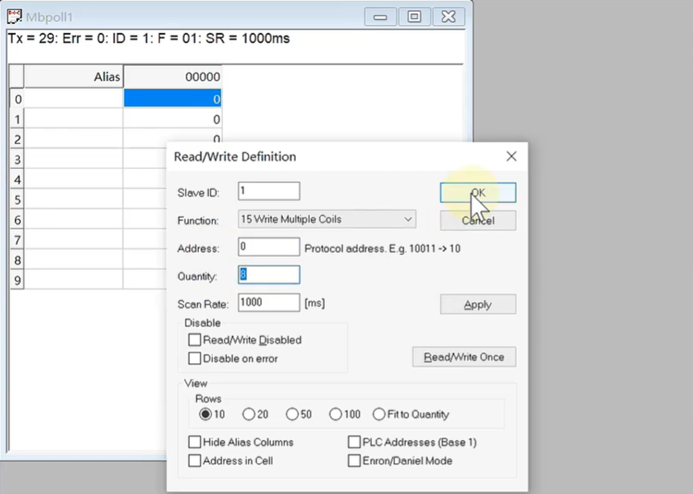 在Modbus Poll中设置一下读写定义;寄存器地址是从0开始的8个;